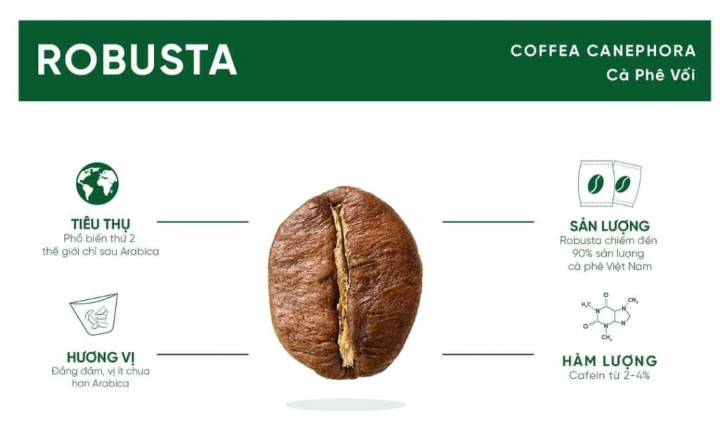ROBUSTA: Về hình dạng, hạt cà phê Robusta có hình tròn, đường kính khoảng 10 – 13 mm. Hạt Robusta có màu nâu đậm và hàm lượng caffeine từ 3 – 4%, trong khi bđó Arabica chỉ chiếm từ 1 – 2%.